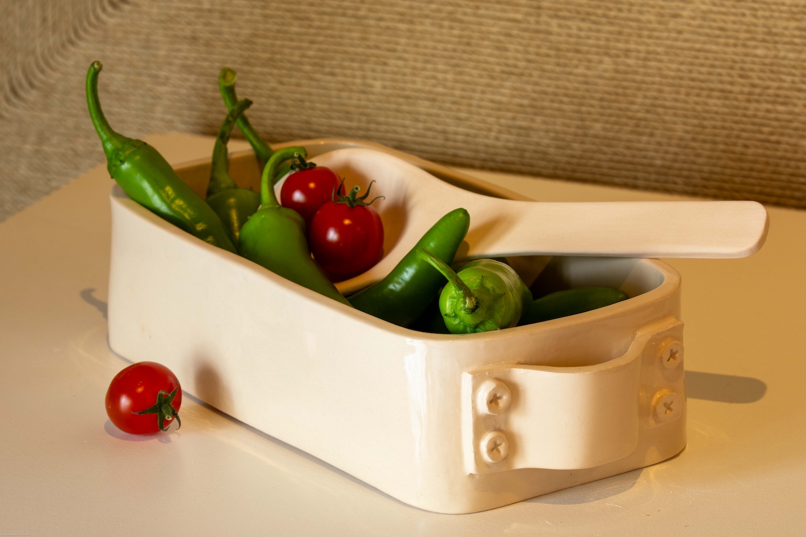 Inspirée du mouvement brutaliste en architecture, cette collection de céramiques travaille la force des volumes, la rugosité des textures et l’épure des formes. Chaque pièce est façonnée à la main, cherchant à exhausser toute la puissance expressive de l’argile. Entre ombre et lumière, fragilité et rigidité, ces pièces modelées et émaillées à la main sont à la fois des ustensiles, des oeuvres décoratives et les fragments d’une architecture de la matière.