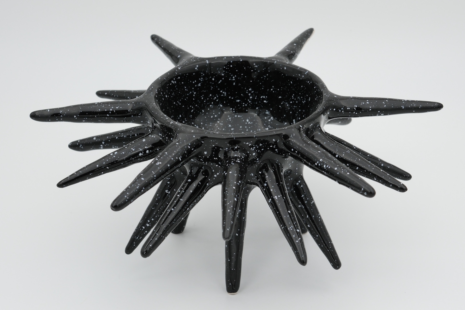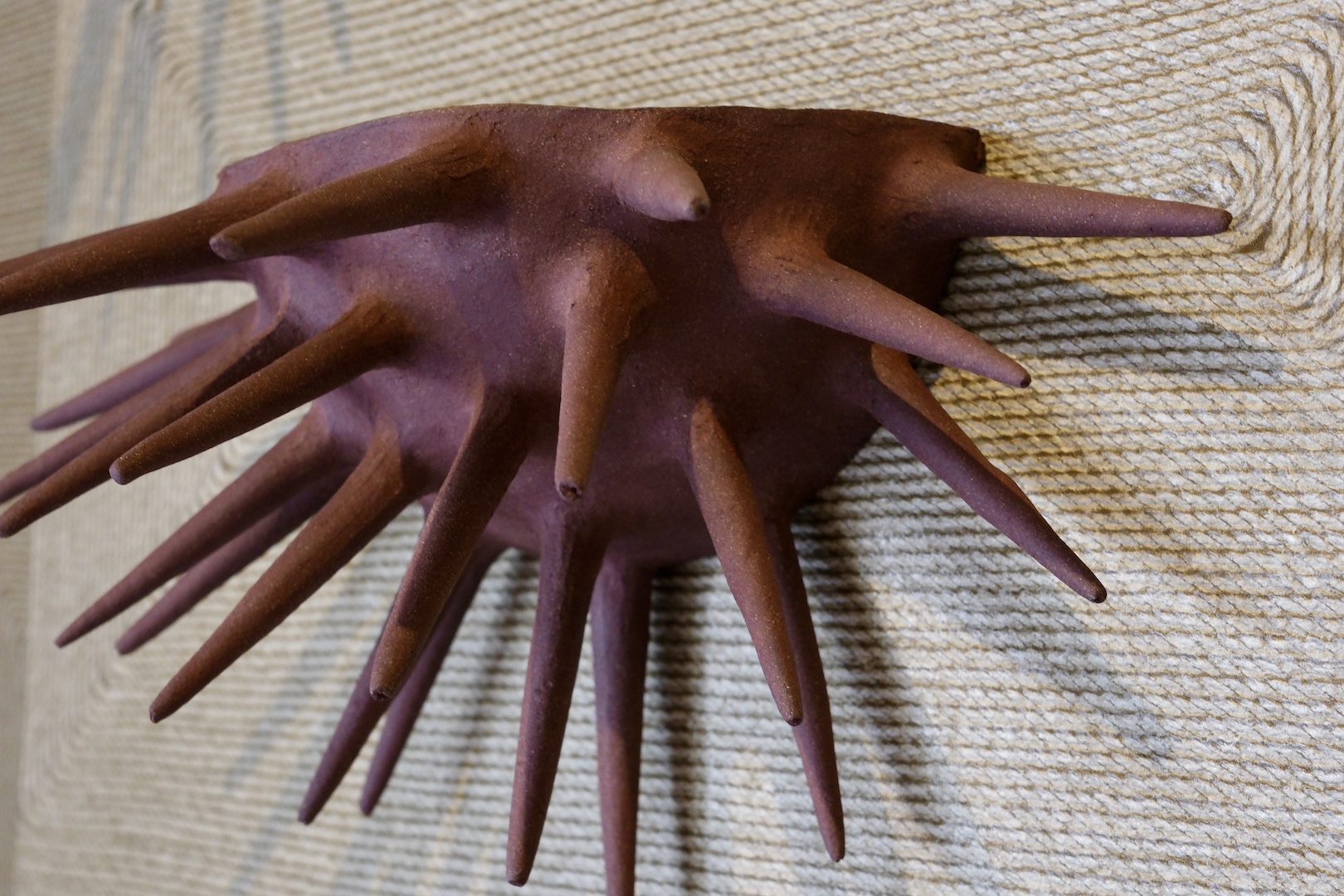 Aucun oursin ne ressemble à un autre ; aucune pièce céramique n’est identique. Un trait d’union de l’animal au minéral se concrétise ainsi : aux infinies variations de couleurs noires, rouges, violettes, brunes ou blanches des oursins répondent celles des terres céramiques, argileuses ou grésantes.