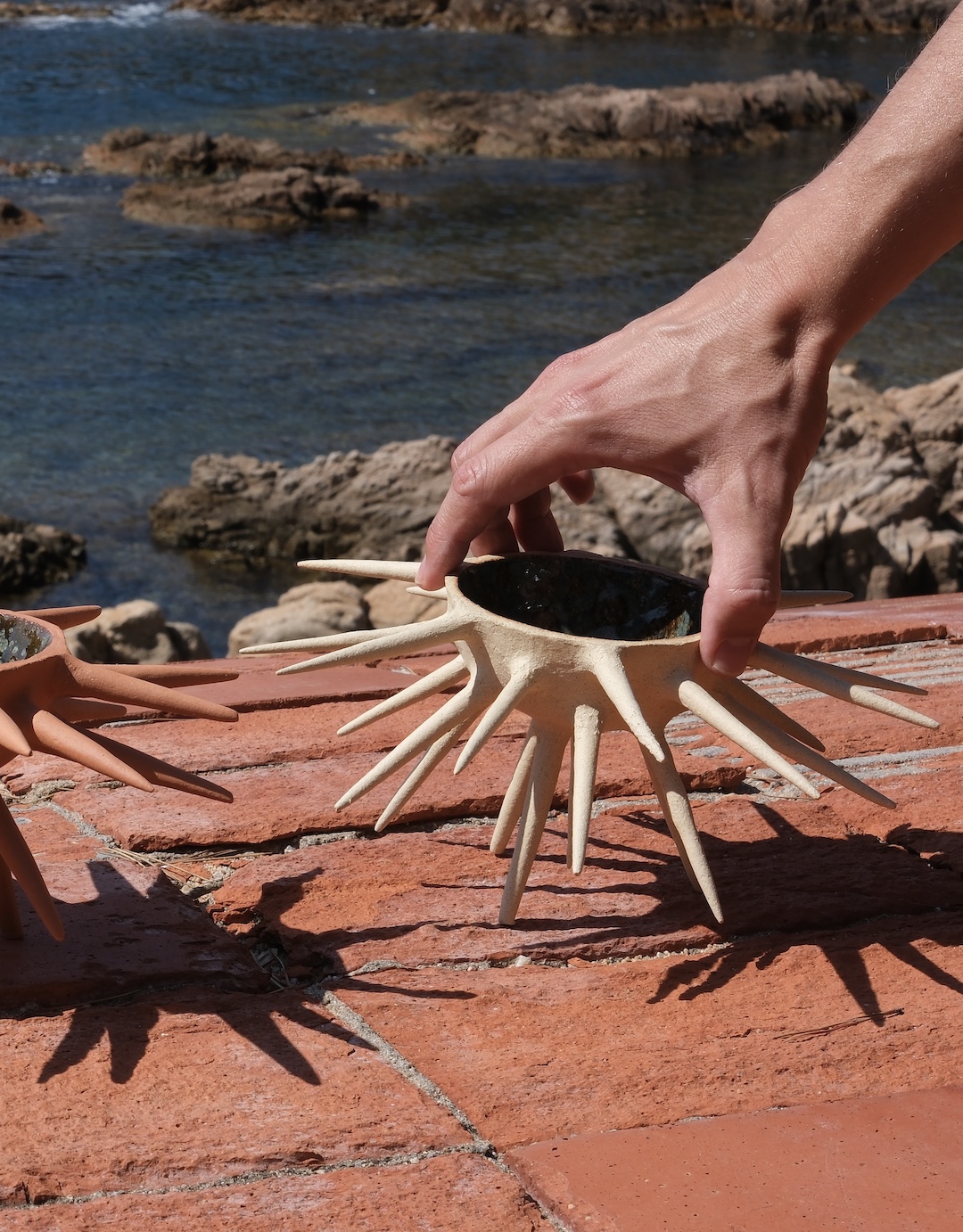 Oursins, anémones, raies et coraux, sentinelle menacée des fonds marins, m’ont inspiré ces pièces uniques en faïence ou en grès. Des créations entièrement façonnées à la main, mêlant tradition céramique et design contemporain, en hommage à la beauté fragile de la Méditerranée.