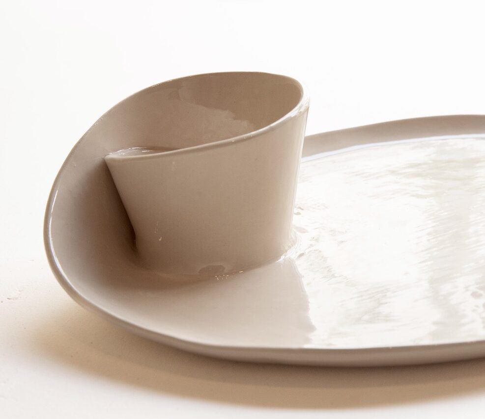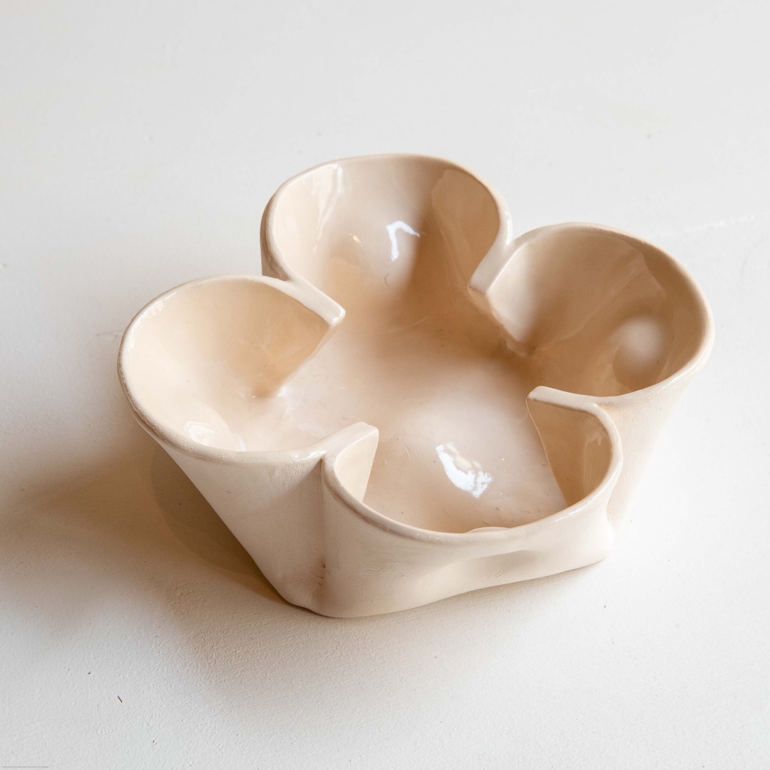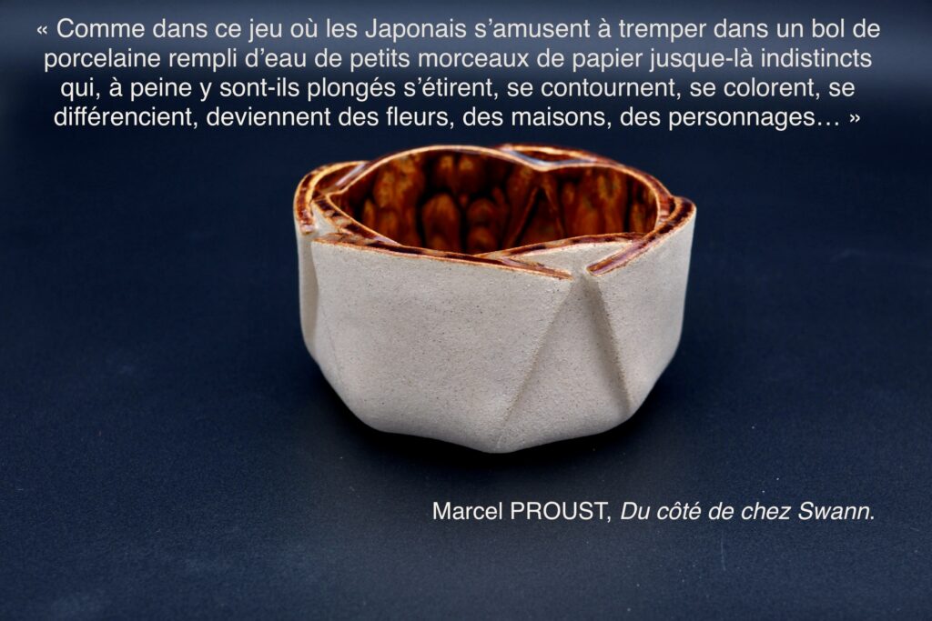 Mes créations céramiques s’inspirent de la pratique des origamistes qui partent d’une simple feuille de papier : à partir d’une plaque d’argile, je façonne des vide-poches, assiettes, bols et objets décoratifs comme des formes de papier plié aux arrêtes anguleuses, aux surfaces symétriques ou isométriques.